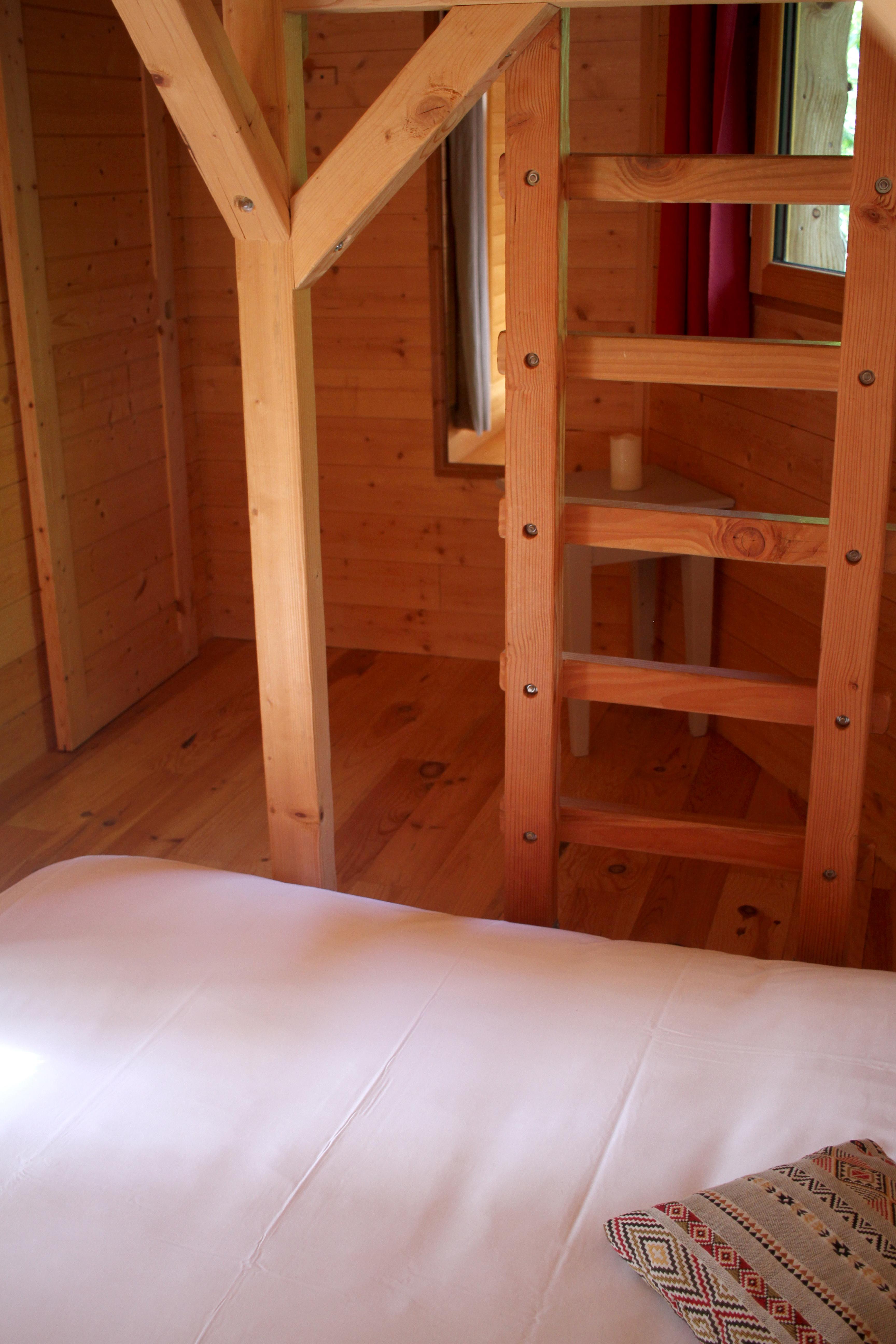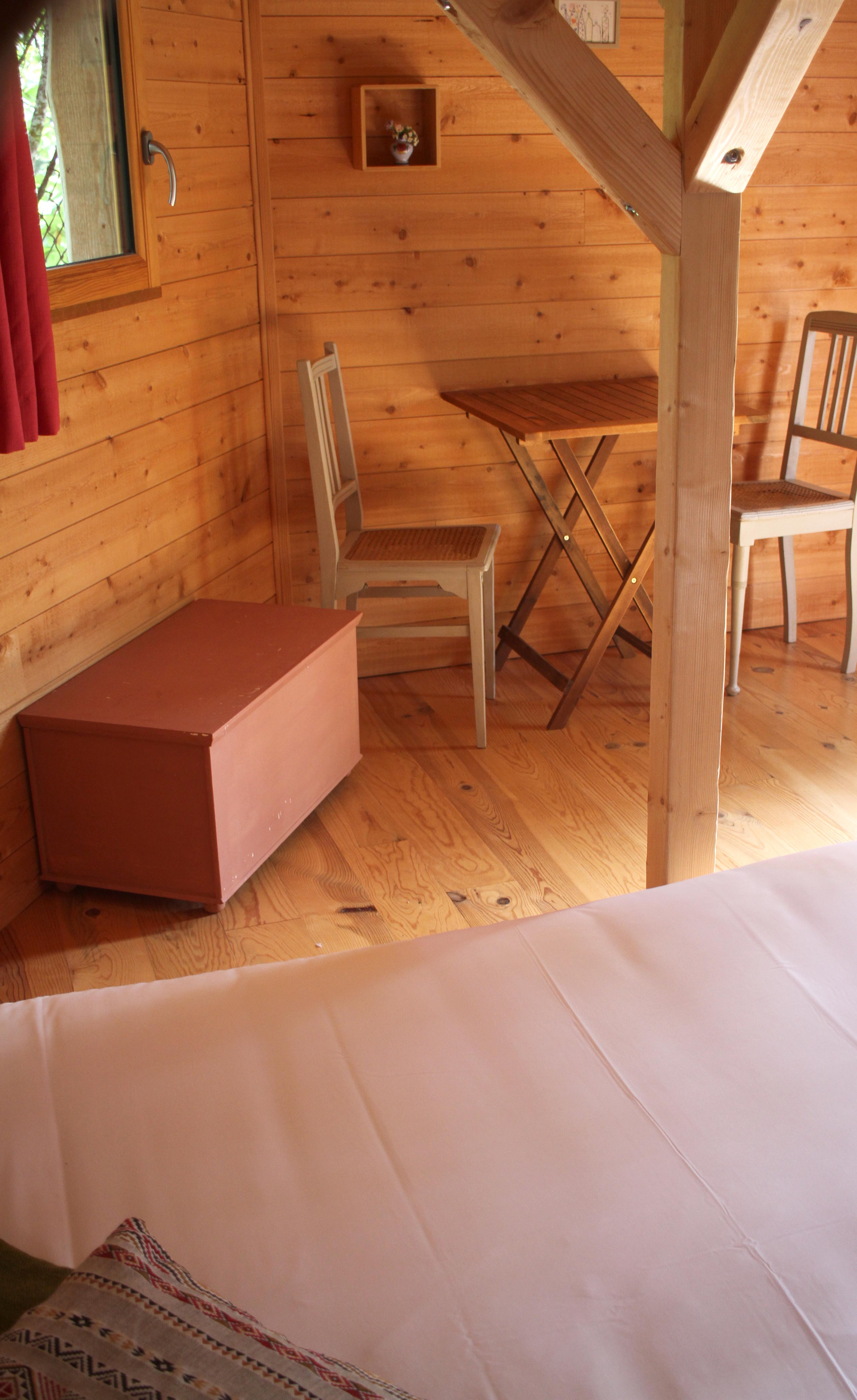 Pour le confort de votre séjour la cabane se compose de ; deux grand lits doubles avec un futon traditionnel( 160*200) japonnais pour le lit parental et un lit mezzanine( 140*190) pour les enfants et grands enfants. Une table avec chaise, d'une malle de rangement, ainsi qu'une vasque à eau et sa réserve d'eau potable.